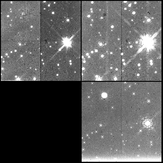 Sample NICMOS Camera 2 parallel images in the F110W, F160W, and F222M filters (clockwise from top left). The bright spot in the upper left of the F222M image is the coronagraphic hole, incompletely removed by the flat field frame.