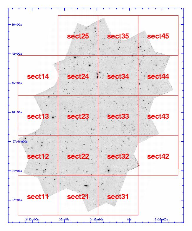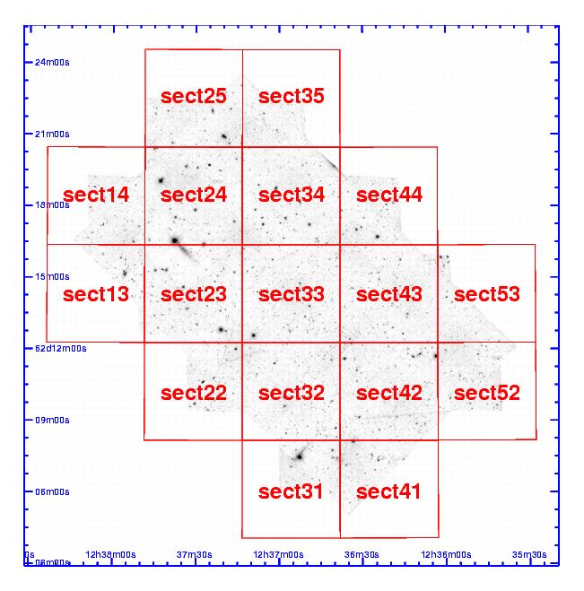 To get the data by section just click in the squares of the images below - this will bring you to a page on which the files can be requested from the ESO/ST-ECF Science Archive. Clicking on the "Name" link on this page will show you a list of files belonging to the section. You need to be a registered archive user in order to request data this way.